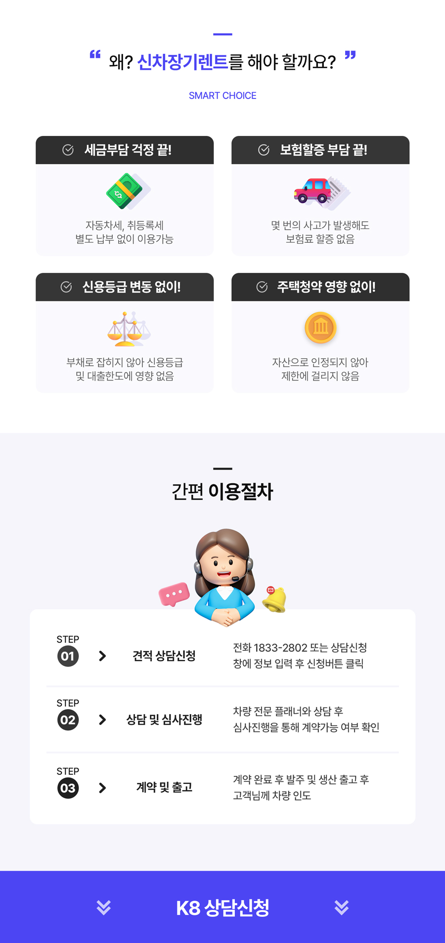 | 장기렌터카, 리스, 할부 등 견적상담 | 이름, 성별, 휴대전화번호, 생년월일, 주소, 운전면허번호, 이메일주소 | 서비스 공급 완료 및 계약 완료시로부터 5년 |